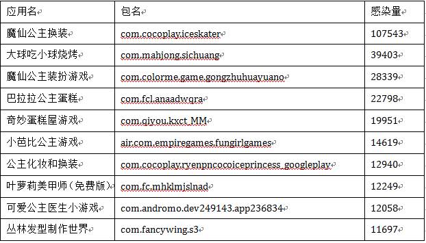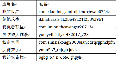 我们发现恶意推送的应用全部来自域名:xiongjiong[.]com和youleyy[.]com,下载的应用以伪装成游戏和色情类app为主,大部分属于SmsPay家族(启动发送扣费短信),部分Rootnik家族(root设备向系统目录注入恶意应用),下表部分推送应用: