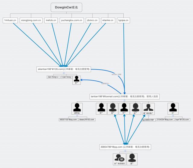 我们通过钱盾恶意代码智能监测引擎,从“DowginCw”病毒家族中提取出如下C&C地址:zbmcc.cn、smfoja.cn、typipe.cn、unfoot.com、yuchanglou.com.cn、inehzk.cn、chunfeifs.com、xiongjiong.com.cn、1mituan.cn、elianke.cn、youleyy.com、cd.zciec.com。从域名的注册邮箱分析,可挖掘出该产业链部分人员,如下图所示。