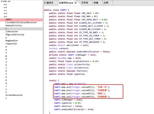 3.插件下载地址来自xiongjiong[.]com或chunfeifs[.]com。成功下载后,随后动态加载ter5.0.jar,并反射执行“init”方法完成恶意推广行为初始化,下图“CWAPI”的静态代码块,可知DowginCw的弹窗方式。