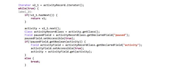 为了能够在设备解锁,任意应用界面弹窗,病毒需要获取当前运行Activity实例。“DowginCw”通过反射获取ActivityThread中所有的ActivityRecord,从ActivityRecord中获取状态不是pause的Activity。