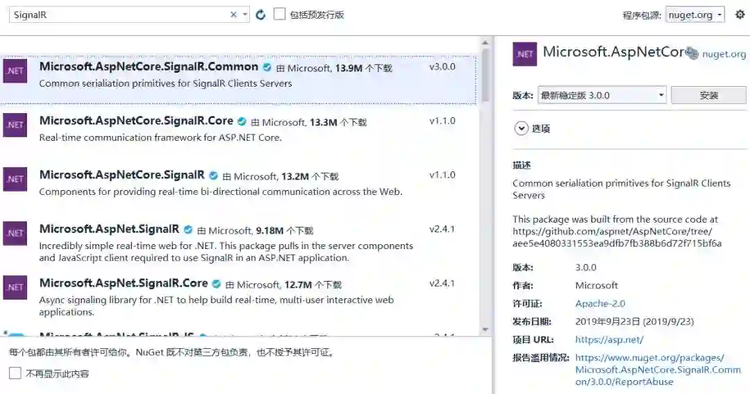 但是只有Common是有3.0版本的,后来发现我需要的是Microsoft.AspNetCore.SignalR.Core,然而这个停更的状态?