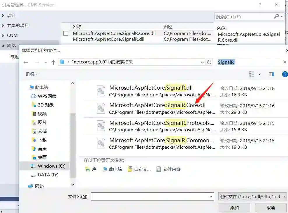右键项目,打开C:\Program Files\dotnet\packs\Microsoft.AspNetCore.App.Ref\3.0.0\ref\netcoreapp3.0 文件夹搜索SignalR,添加引用即可。