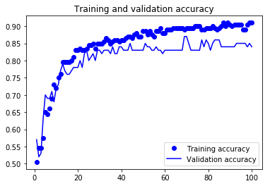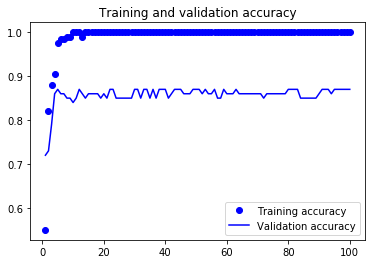 epochs = 100model = models.Sequential()model.add(layers.GlobalAveragePooling2D(input_shape=(7,7,512)))model.add(layers.Dense(1, activation='sigmoid'))model.summary()# Compile modelmodel.compile(optimizer=optimizers.Adam(),loss='binary_crossentropy',metrics=['acc'])# Train modelhistory = model.fit(train_features, train_labels,epochs=epochs,batch_size=batch_size, validation_data=(validation_features, validation_labels))