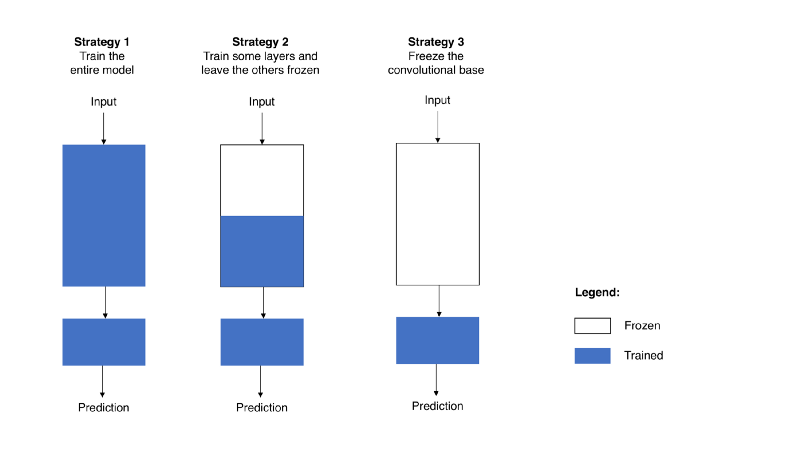 当你根据自己的需要重用预训练模型时,首先要删除原始的分类器,然后添加一个适合的新分类器,最后必须根据以下的三种策略之一对模型进行微调:
