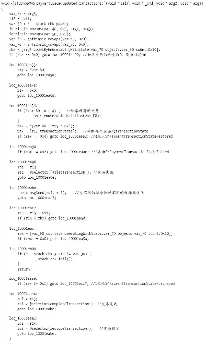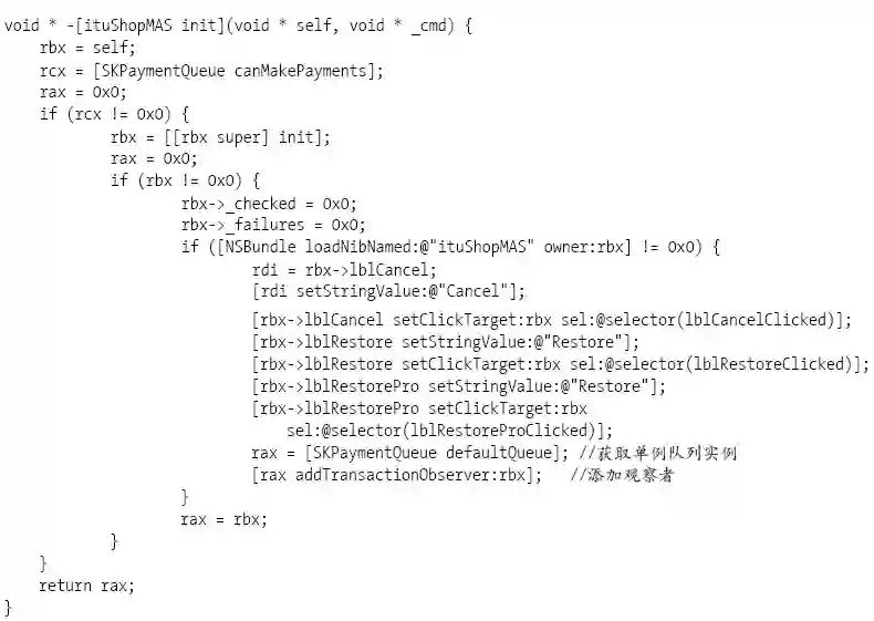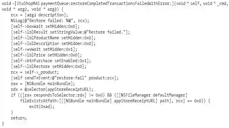 虽然做到通用破解有些难度,但针对个体内购机制的App破解,难度可能就没这么大了。一个典型的破解思路是:修改-paymentQueue:updatedTransactions:方法的代码逻辑,将交易transactionState为SKPaymentTransactionStateFailed时的代码逻辑改成SKPaymentTransaction- StatePurchased时的代码就可以了。而在具体执行破解操作时,可以使用爆破的手段在程序中进行修改,或者使用Hook技术,对方法的返回结果进行Hook。