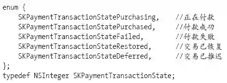 这两个方法传入的参数都是一个SKPaymentTransaction类型的数组,每一个SKPayment- Transaction代表着一个支付交易对象,应用程序要明确地处理每个交易对象的返回结果,根据它的transactionState属性来判断交易是否成功。如果transactionState的值是SKPayment- TransactionStatePurchased,则表示交易成功,此时程序应该向用户提供收费成功后的功能;如果transactionState的值为SKPaymentTransactionStateFailed,则表示交易失败,应用程序应该获取交易失败的错误信息并反馈给用户。交易的状态是一个枚举值,定义如下: