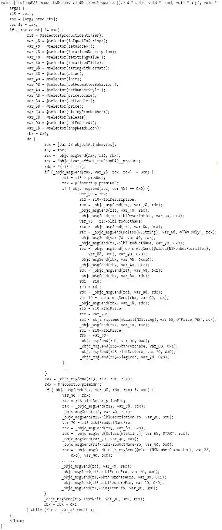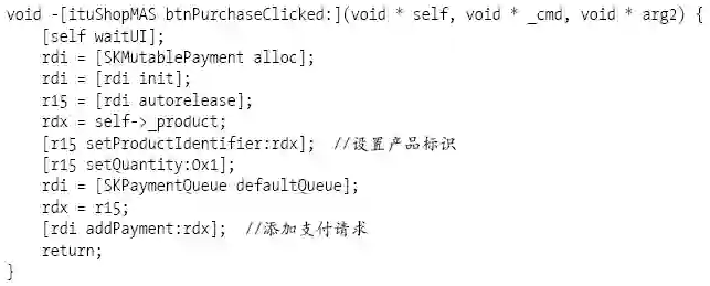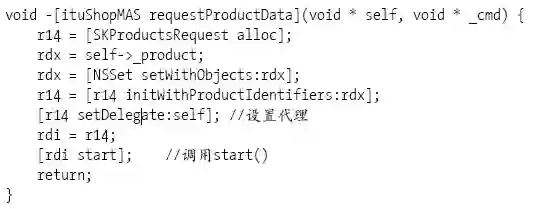 SKProductsRequest 构建完成后,再为它设置一个代理delegate,用来处理返回的信息。最后调用它的start()方法。从App Store中下载一个App,查看相应的伪代码,如下所示: