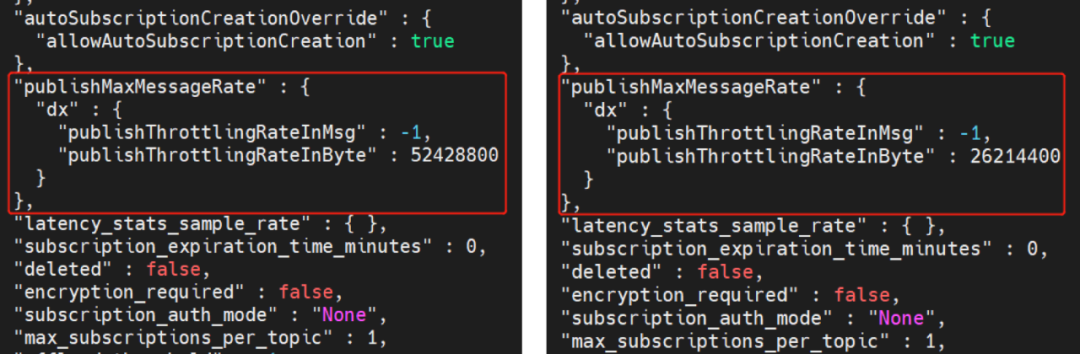 我们对一些 Namespace 进行限流操作。如下图左侧,需要限制生产者总流量为 50M,多余的部分会被拒绝,从而更好地保障集群;如下图右侧,需要限制所有 Topic 的生产者流量为 20M。不同的总流量数值都是根据业务评估得出。
