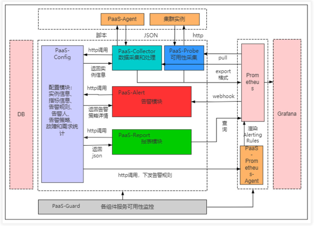 上述告警链路主要借助内部 PaaS 平台的微服务来模块化和清晰化整个告警流程,每个模块专职专责。自上而下,链路包括 PaaS-Agent 感知服务、PaaS-Collector 数据收集服务、PaaS-Probe 集群可用性采集服务、PaaS-Alert 告警模块等。数据从 PaaS-Agent 的节点服务器服务出发,经过 Collector 收集、Prometheus 采集到最终的 PaaS-Alert 进行精筛,对比当前阈值是否满足预期。