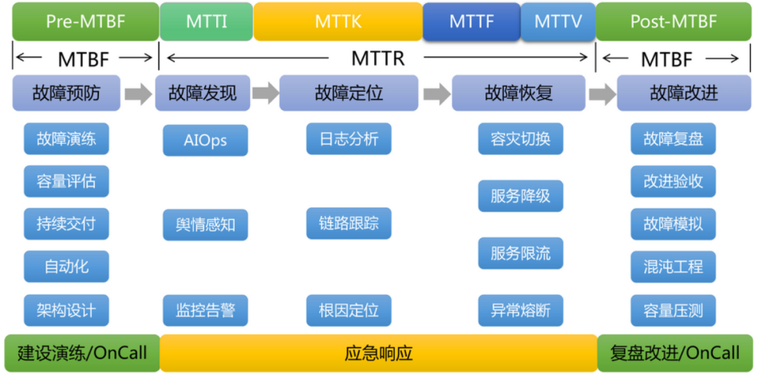 上图是讯飞云内部结合经验沉淀的 SRE 流程。它分为 MTBF(故障平均间隔时间)和 MTTR(故障平均修复时间)两个部分。MTTR 又分为故障发现、定位、处理和恢复的流程。本次分享中主要针对容量评估、架构设计、监控告警和服务限流其中几个模块,讲解 SRE 的保障理念。