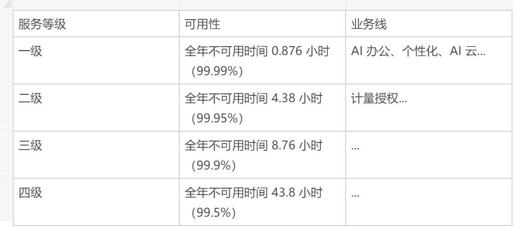 测算方法:可用性 % =(服务总时长-累计影响时长)/ 服务总时长