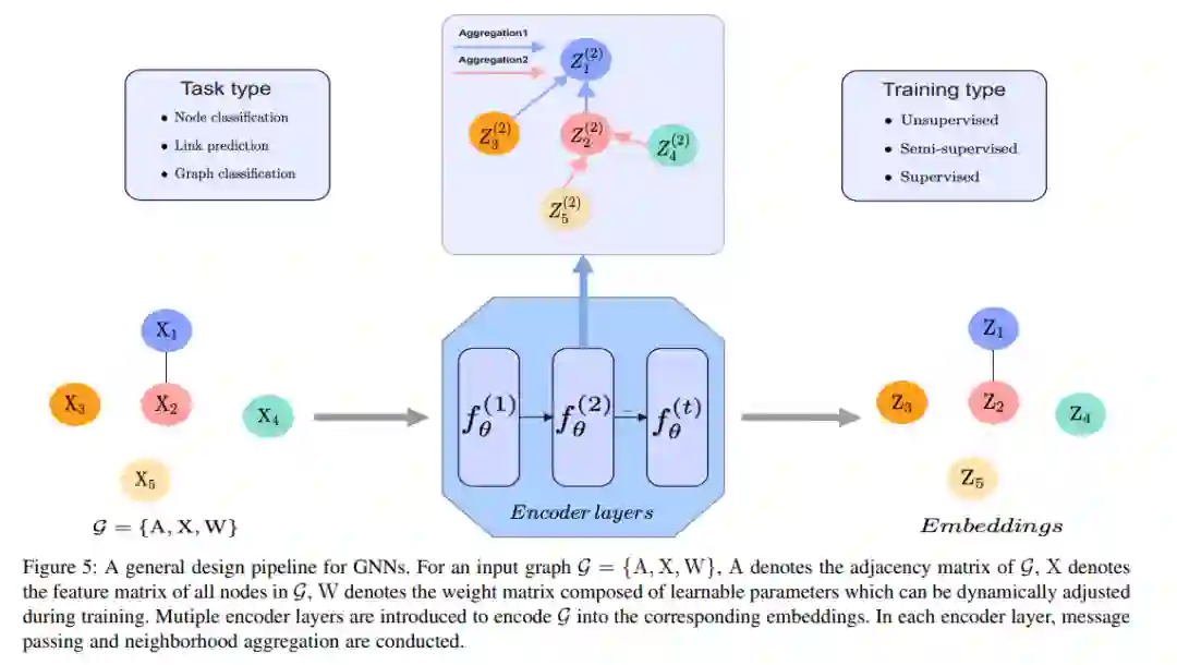 图是一种常用的数据结构,用于描述社交网络、推荐系统等复杂系统。在过去的几年中,由于图的强大表达能力,图表示学习[163]逐渐引起了机器学习界的关注,它旨在建立能够从非欧几里得数据中高效学习的模型。与此同时,各种图神经网络[164]应运而生,它们在结构化数据挖掘任务中显示出巨大的潜力,如节点分类、链接预测或图分类等。然而,当这些图数据挖掘任务遇到许多无监督/有监督的场景,其中很少,甚至没有有效的数据或标签存在,如何提高这些任务在图上的性能,并在这些情况下获得一个鲁棒的模型?同时,图神经网络的关系结构发现[165]、[166]、[167]、表征能力[168]等有意义的子主题也有待探索,从数据表示的角度来看,可能也需要有效的思路。针对上述问题,对小数据的学习可以提供必要和强大的支持,由于其可观的数据发现效率和较强的表示能力,可以促进图表示学习的发展。特别地,图5给出了GNN的一般设计流程。在该设计流程的方案下,GNN可分为递归图神经网络、卷积图神经网络、图自编码器和时空图神经网络。分类的详细描述如下[164]。