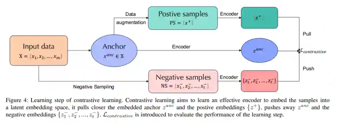 自监督学习[153]由于能够避免标注大规模数据集的成本而受到关注。它主要利用前置任务从无监督数据中挖掘监督信息。利用构建的监督信息,我们可以进行模型学习,获得对下游任务有价值的表示。与此同时,对比学习[154]、[155]、[156]、[157]、[158]最近成为自监督学习中的一个重要子课题,其目的是学习一种表示法,该表示法可以将具有对比损失的正对组合得更近,并将负对推离潜在嵌入空间。图4展示了对比学习中的一个学习步骤。