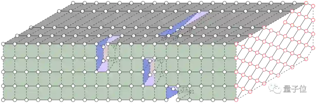 上图中,最左侧一层表示53个量子比特的初始状态,最右侧一层表示终止状态。新算法通过切断网络的一些连接来简化关系,从图像上看就像是在三维网络上“钻孔”。