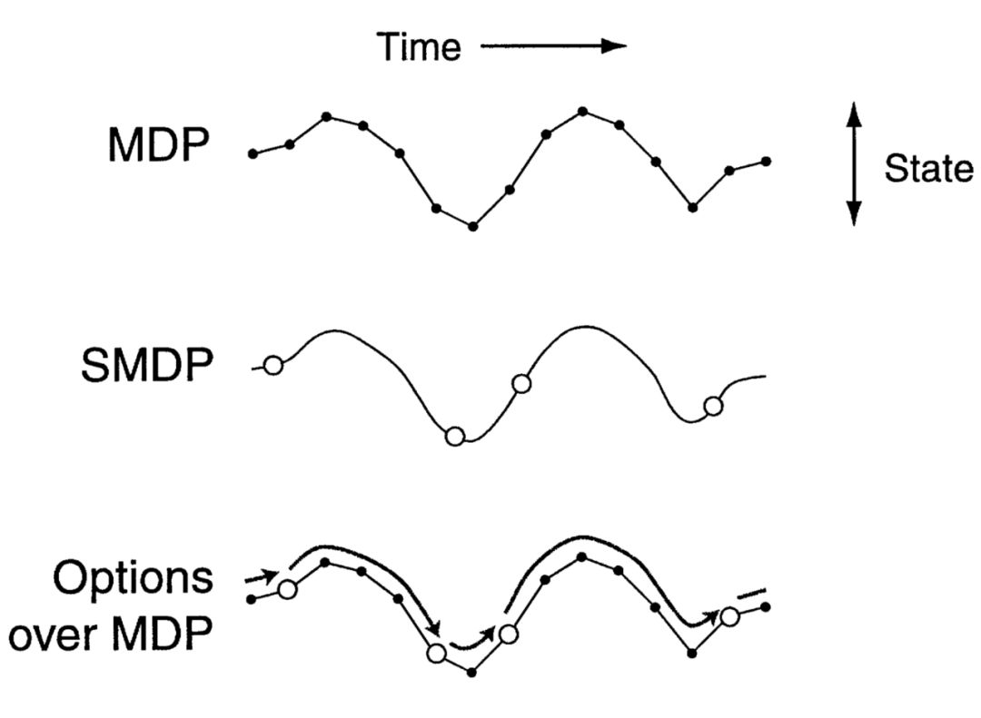 为了真正理解在学习算法中需要一个层次结构,以及为了在RL(增强学习)和 HRL 之间架起桥梁,我们需要记住我们正在努力解决的问题: MDPs (马可夫决策过程)。 HRL 方法学习由多个层组成的策略,每个层负责时间抽象的不同级别的控制。 事实上,HRL 的关键创新之处在于扩展了一系列可用的操作,这样受训者不仅可以选择执行基本操作,而且还可以执行宏操作(即一系列较低级别的操作)。 因此,对于随着时间推移而延长的行动,我们必须考虑到决策时刻之间所经过的时间。 幸运的是,MDP 规划和学习算法可以很容易地扩展以适应 HRL。