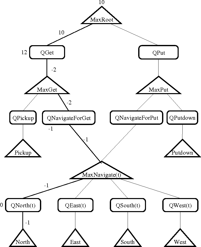 MAXQ 是一种深度学习算法,通过将状态-动作对的 Q 值分解为 Q(p,s,a) = V(a, s) + C(p,s,a)得到任务的层次结构,其中 V(a,s) 是执行状态为 a 的动作时期望得到的总奖励(经典Q-learning中的Q), C(p,s,a) 是父任务执行后期望得到的总奖励。 事实上,动作 a 可能不仅包含一个原始动作,而且还包含一系列动作。