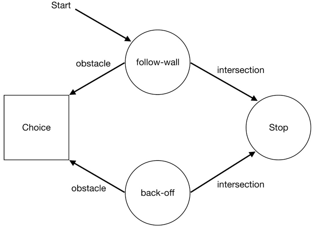 在上面的例子中,每次遇到障碍时,机器进入一个 Choice 状态,在这个状态中,机器要么选择"跟随墙机器"(它只是在某个方向上不断地跟随墙) ,要么选择"后退机器"(后退并继续执行)。因此,学习机的策略是以多大的概率来决定调用哪台机器。