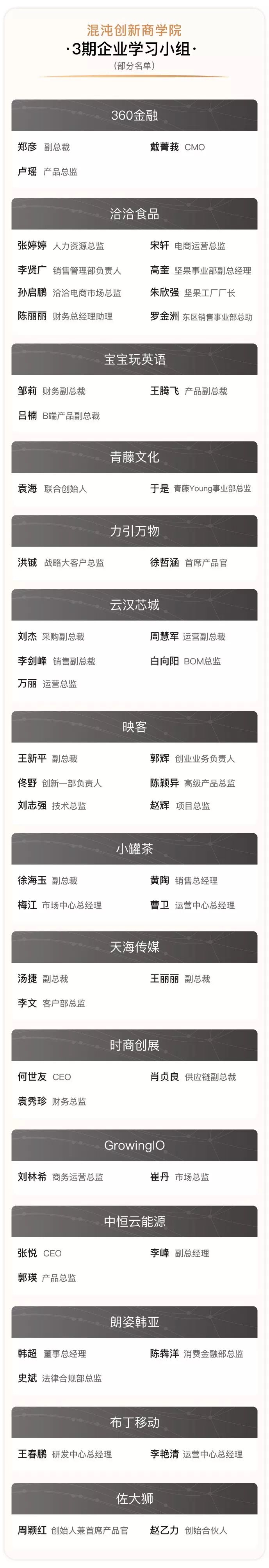 2019年5月6日,混沌创新商学院第三期招生发布以来,我们已收到了近800份商界精英的申请。截至目前,已有来自小罐茶、洽洽食品、分众传媒、创维集团、青藤文化、宝宝玩英语、天海传媒、布丁移动、朗姿韩亚等100+企业学员加入学习。