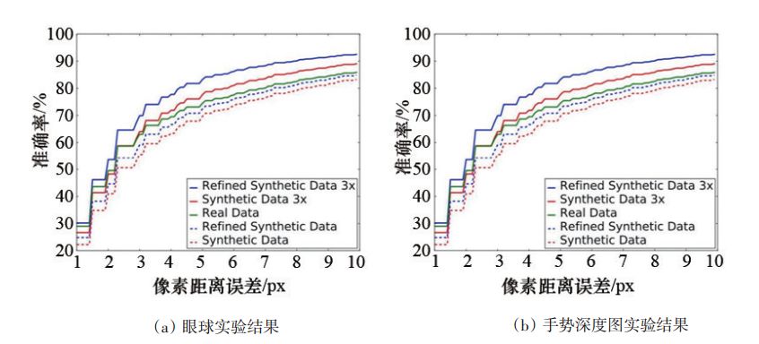实验结果的横轴是误差的阈值,纵轴是深度网络的准确率,从实验结果可以看出,用精炼网络的输出图片训练深度网络,其测试结果要优于用原始仿真图片训练深度网络的测试结果;此外,由于仿真图片的获取是十分容易的,研究者还测试了大量数据对训练深度网络的增益,在手势深度图片实验中,采用 3倍于真实图片的精炼后仿真图片训练深度网络,其效果优于直接用真实图片训练深度网络(图5)。