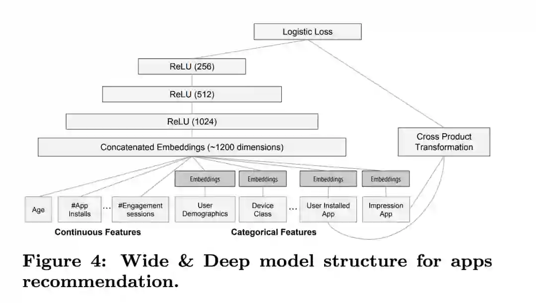 这个是原论文中的架构图,我们自己在实践的时候不一定完全遵守。比如架构图中Wide部分只是使用了交叉特征,我们在使用的时候可以把原始的离散特征或者打散后的连续特征加过来。