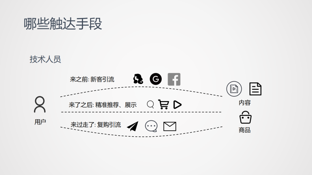 在用户来之前可以进行渠道优选与新客引流,用户来了之后可以对用户进行精准推荐、展示,用户来过走了之后可以对用户进行复购引流,在每个阶段,画像都可以发挥重要作用。