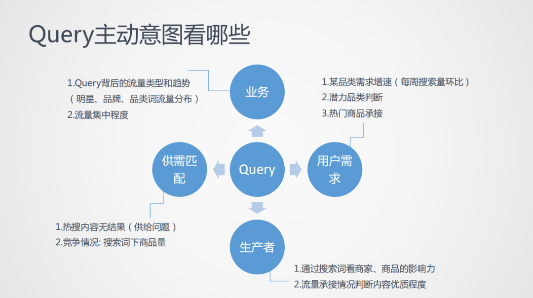 分析Query场景是分析用户意图的有效方法。在业务方面,通过统计Query场景下的流量和业务趋势,可以发现用户对于明星、品牌、品类的偏好,流量的集中程度可以有效的反映出用户的偏好程度。同时用户流量的集中程度可以驱动我们去发现供给端是否有问题,例如热搜内容无结果就属于供给端出现问题。在用户需求上,可以进行环比的比较,如每周搜索量环比比较,例如连衣裙在搜索量环比增长明显,那么可以进一步进行某些梳理,判断潜力品类在推荐等场景下进行潜力产品推送。对于平台商家、商品,结合用户画像标签,可以根据用户搜索词分析平台内商家、商品的影响力,对商家进行划分,找出比如特色商家、优质商家、黑产商家等,进一步去分析平台是否将优质的流量分配给了优质的商家。