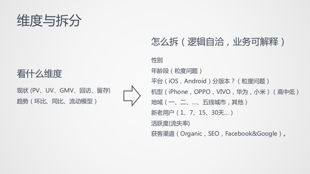 刚刚说到,要对用户群进行拆分,可以从多种不同维度出发,例如对现状的统计,有PV、UV、GMV、回访、留存等,对趋势的统计如环比、同比、流动趋势等。具体的如何对用户进行拆分,要从业务出发,做到逻辑自洽,业务可解释,比如根据性别、年龄段、设备平台对用户进行拆分,这就涉及了粒度问题,比如年龄段是将15~25岁还是将15~30岁划分为一个区间,安卓或iOS版本号如何划分区间。