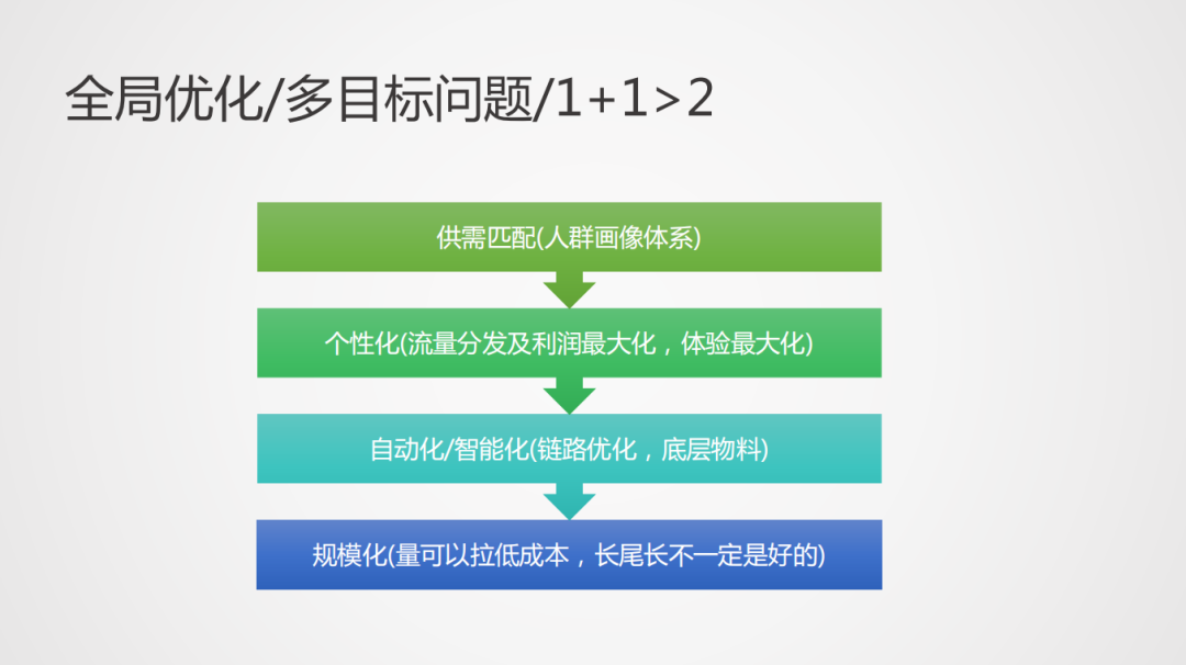 从全局优化来讲,构建人群画像体系可以获知群体的需求,进而优化供需之间的匹配;进一步可以在个性化层面进行优化,实现流量分发以及利润最大化,更优的个性化也会带来用户体验的最大化;用户画像可以自动化/智能化的实现物料投放和供需匹配结果;结合用户画像可以优先去拓展与大盘群体相似的群体,能更好的实现规模化,这里补充一点:电商场景下用户具有长尾效应,但是平台更希望流量具有一定的集中度,以便更好的优化成本。