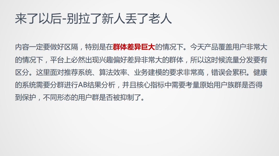做好新用户服务的同时,要保证老用户的体验不会变差。在内容平台的推荐场景下中,这类问题变得尤为明显。在产品覆盖用户非常大的情况下,平台必然会出现兴趣偏好差异非常大的群体,针对不同群体,要考量其不同需求,在内容上做好区隔。