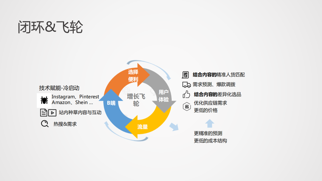 使用闭环和飞轮的思想更好的迭代用户画像和整个系统。首先是以技术赋能解决冷启动,分析其他平台上热销的商品,结合市场运营的指导来做初步的投放,根据初步的投放效果分析用户的偏好用于指导站内的需求预测,使得预测更精准,有了初步的流量之后就可以不断的进行迭代。