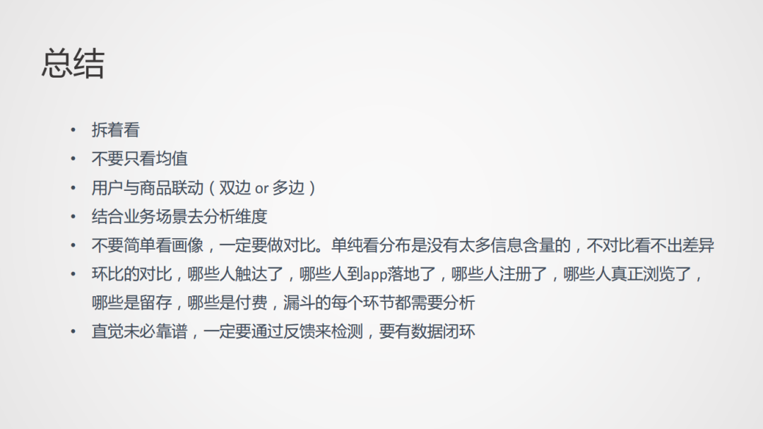 用户和商品联动:分析结果要将用户和商品联动,关注供给侧是否满足了用户的需求,推荐展示是否满足了用户的需求,根据用户画像驱动供给侧、前端的优化;