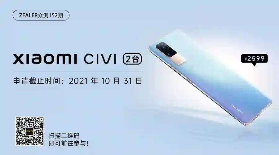 想知道天生好看是什么感觉吗?ZEALER 众测限时上新,带来新一代自拍神器——小米 Civi 。像素级肌肤焕新技术还原天生美肌;AI 三摄、16 种Vlog 模式,轻松出大片;搭载骁龙 778G 芯片,还有 120Hz 高刷 10.7 亿色 OLED 大屏、不到 7mm 的轻薄机身......更多体验,上手了才知道!扫描上方二维码或戳左下角「阅读原文」即可前往参与试用。