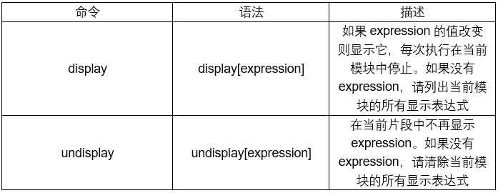 与使用p和pp打印表达式类似,你可以使用命令display [expression]告诉pdb自动显示表达式的值,如果它改变,执行停止。使用命令undisplay [expression]来清除显示表达式。