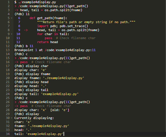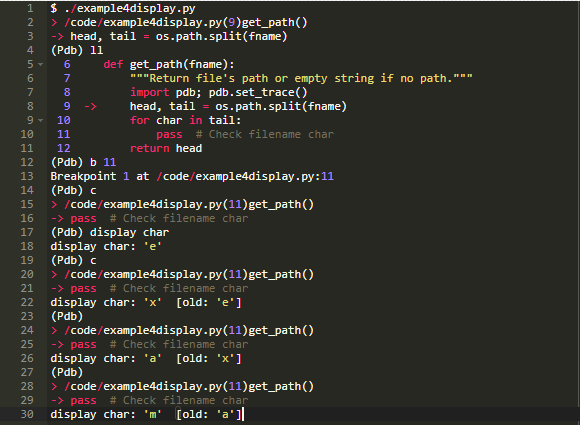 在上面的输出中,pdb自动显示char变量的值,因为每次命中断点时,其值都发生了变化。有时这是有用的,正是你想要的,但还有另一种使用display的方式。