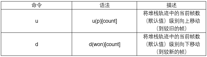 你可以使用两个命令u(up)和d(down)来更改当前帧。与p结合使用,你可以在任何帧的调用堆栈中的任意点检查程序中的变量和状态。