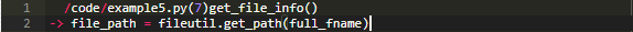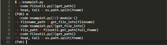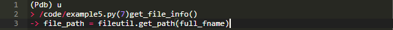 注意在上面的u的输出中,pdb在第一行的开始处输出了箭头>。这是pdb让你知道帧被改变了,这个源位置现在是当前帧。现在可以访问变量full_fname。另外,重要的是要实现以第二行上的 - >开始的代码行。由于帧被移到堆栈上,所以调用了fileutil.get_path()。使用u,我们将堆栈(从某种意义上来说)移动到调用fileutil.get_path()的函数example5.get_file_info()中。