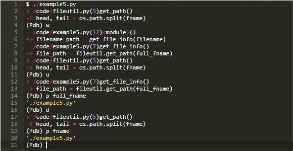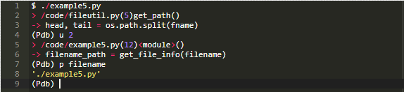 我们来看一个使用u和d命令的例子。在这种情况下,我们要检查example5.py中函数get_file_info()的局部变量full_fname。为了做到这一点,我们必须使用命令u将当前帧提升一个级别: