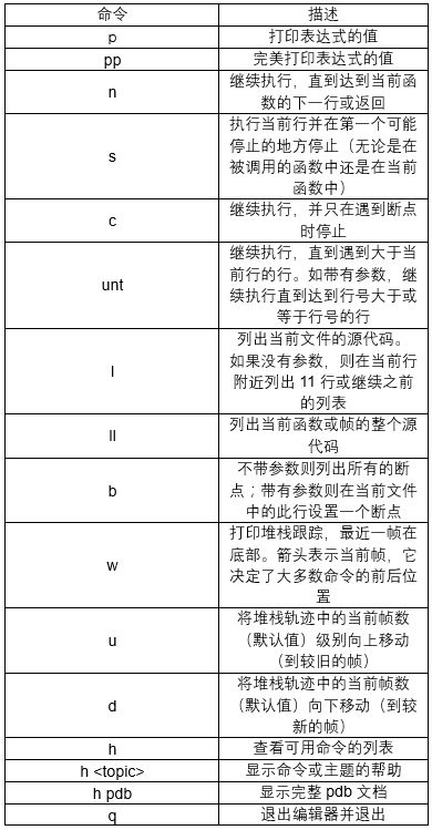 在pdb提示符下输入(Pdb)h pdb获取pdb的完整文档