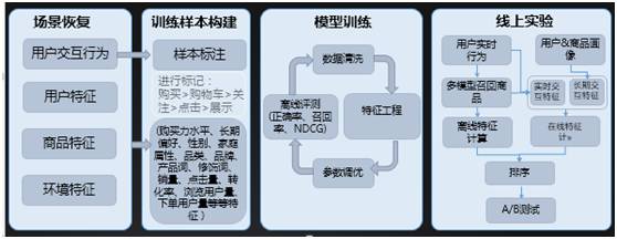 推荐排序训练流程分别为场景恢复、训练样本构建、模型训练和线上实验这四部分。