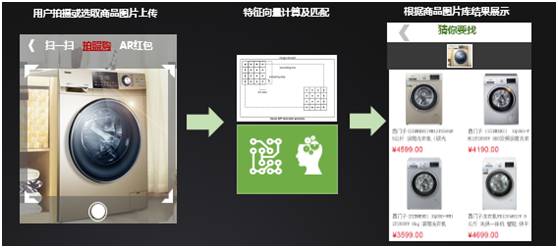 当用户拍照或者从 PC 和手机选取商品图片上传成功以后,系统就会进行特征向量的计算及匹配。之后猜测用户想要的商品,根据商品图片库的相关结果进行展示。