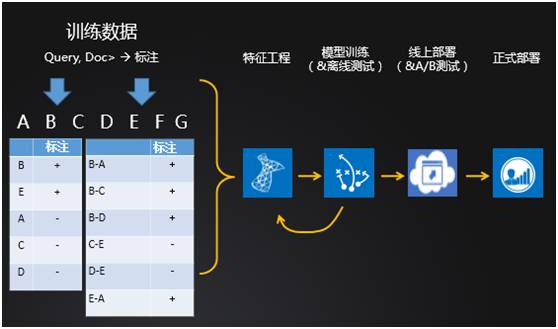 先要对海量的数据进行训练,基于用户、查询、商家数据找特征,之后做模型训练,经过线上部署之后,正式上线。