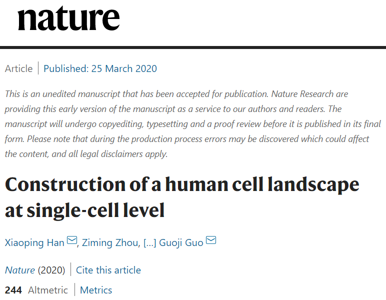 北京时间 3 月 26 日,《自然》在线发表了浙江大学医学院郭国骥团队题为“Construction of a Human Cell Landscape at Single-cell Level”的重磅论文,描述了首个人类细胞图谱,描述了人体主要器官的细胞类型构成。