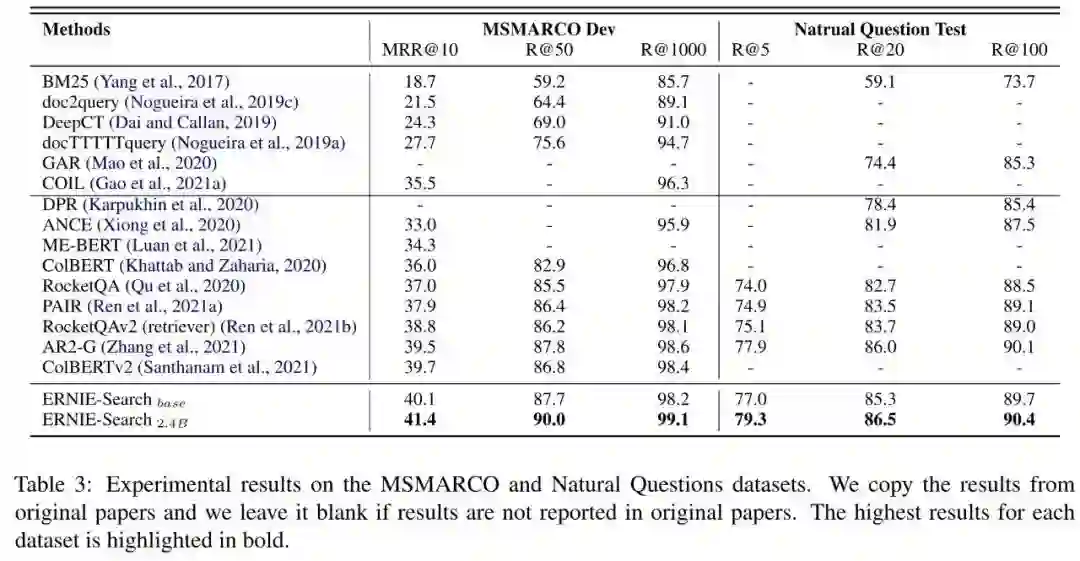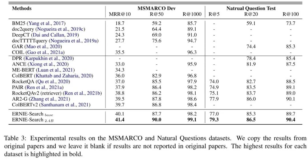 ,ERNIE-Search 在 MARCO 和 NQ 检索数据集上均取得了 SOTA 性能(虽然没出几天就被超越了)。