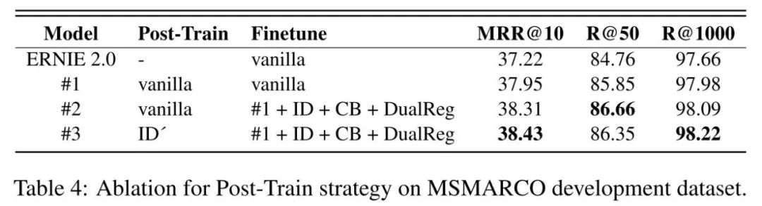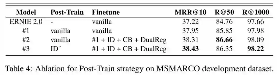 作者首先对 Post-Train 策略进行了消融实验,如下图所示,Vanilla Post-Train 表示 coCondenser 预训练,Vanilla Finetune 表示 DPR 原始的对比损失训练,ID 表示 Interaction Distillation,CB 表示 PAIR 中的 Cross-Batch 策略,ID' 表示 ID+CB,DualReg 表示前文提到的 Dual Regularization。该消融实验主要表明了将 ID' 策略加到 Post-Train 中是有效的,但需要注意这里作者并没有去掉 CB 策略单独对比 ID 策略。
