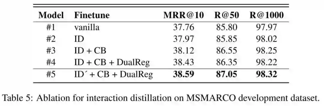 综上,作者提出的 Interaction Distillation 实际上就是将 ColBERT 的 MaxSim 打分作为了一个辅助信号来引导 Dual-Encoder 的训练,这一结构有效地避免了 Dual-Encoder 和 ColBERT 内部知识表示不一致的问题。另外,这一结构也不需要像传统的知识蒸馏那样,需要先训好一个 teacher,再训 student,该结构可以通过一次正反向传播同时训练 teacher 和 student。
