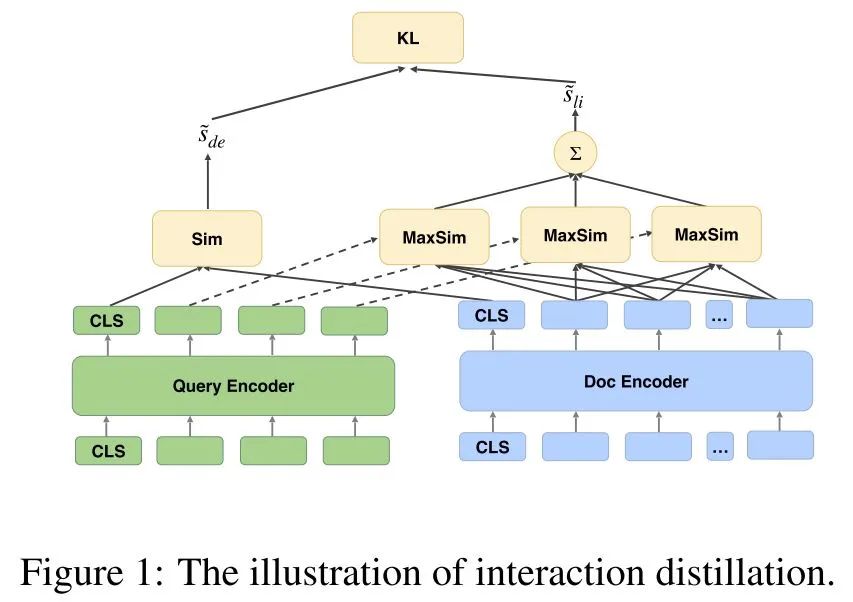 作者发现,当我们将 ColBERT 作为 teacher 时,这一思路有一种很简单的实现方式。如上图所示,由于 ColBERT 和 Dual-Encoder 的相关性建模均发生在顶层,我们可以自然而然地共享它们的底层参数,当输入的 query 和 document 均被编码为低维稠密向量后,我们可以分别计算 Dual-Encoder 的 Dot-Product 相关性和 ColBERT 的 MaxSim 相关性打分: