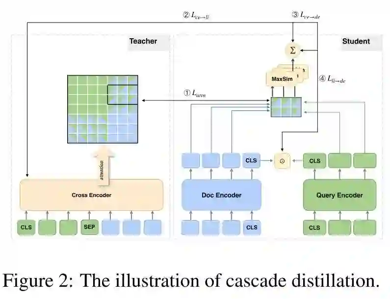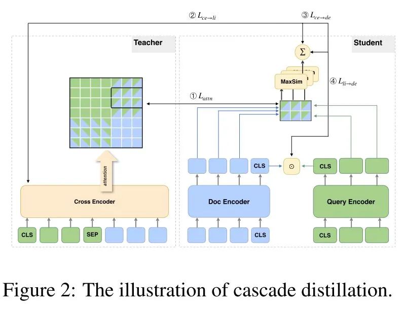 那么 Cross-Encoder 蒸馏 ColBERT,是不是也可以采用上面提到的 Interaction Distillation 策略呢?很遗憾,作者并没有想到一个可以兼容这两者的结构,因为 Cross-Encoder 和 ColBERT 的结构有着本质的区别,若将底层的编码器换成交互式结构,那么 ColBERT 顶层的 late inteaction 结构是没有意义的。因此,作者提出的 Cascade Distillation,本质上其实就是额外引入 Cross-Encoder 的蒸馏损失来进一步辅助 Dual-Encoder 的训练,使得知识可以从 Cross-Encoder 逐步传递到 Dual-Encoder。