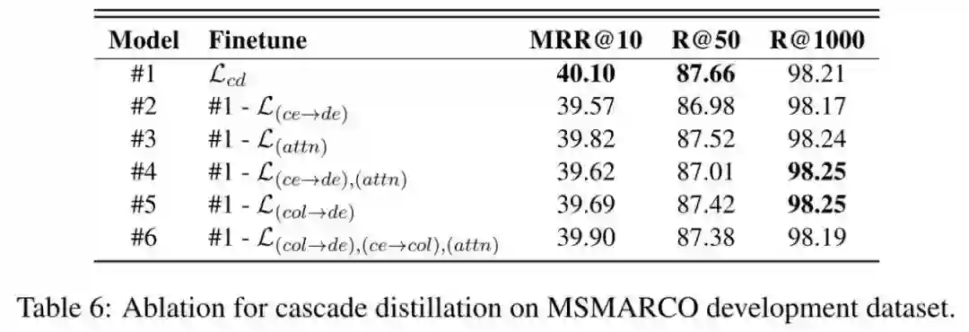 性能下降最为严重,说明 Cross-Encoder 直接蒸馏 Dual-Encoder 在实践中其实是很有效的,而去掉作者提出的 Cascade 损失和 Attention Map 损失 ,MRR@10 仅下降了 0.2pp。