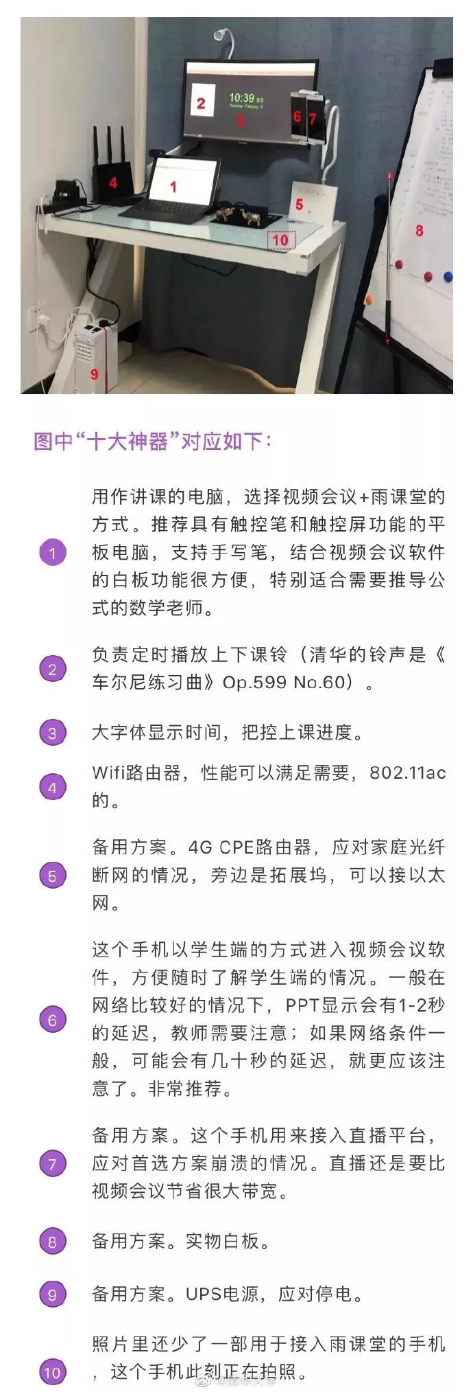 连日来,清华大学软件学院副教授杨铮开始探索居家工作环境的改造升级,亮出“十大神器”。杨铮说,“不能说万无一失,但有10大‘神器’护法,无论是断电、断网、硬件崩溃、软件崩溃,都不能阻挡我一颗上课的心!”他表示,自己想尽所能创造出一个环境,让同学们在非常时期不松懈,真正做到“按点上课、一起上课、真有课堂”。
