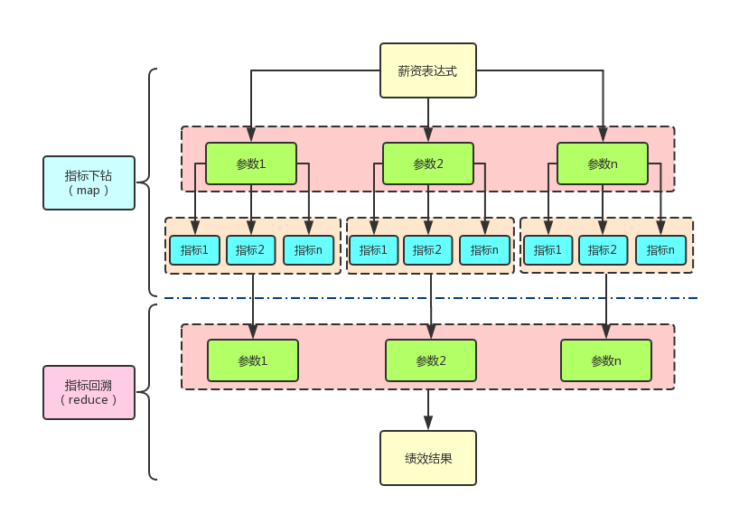此处实现了参数粒度的并行计算,接下来再进行指标级别的下钻。若该处的指标为复合指标时,计算引擎会继续下钻到基础指标级别;待所有的指标计算结果就绪后,会触发计算引擎的回溯计算流程(类似Hadoop中的reduce过程),依赖于各指标的参数因子会被计算并保存。当各参数因子准备就绪时,直接生成绩效最终结果。
